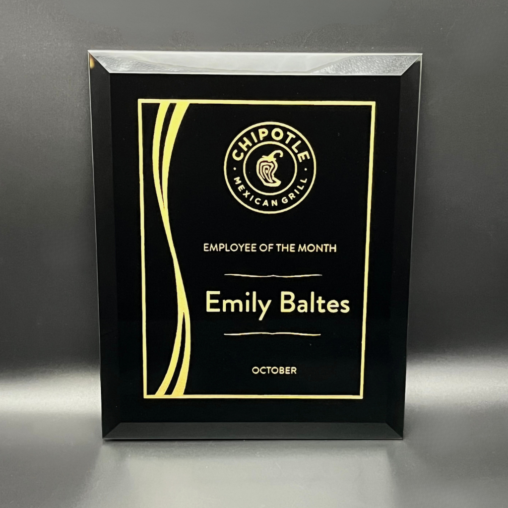 This sleek contemporary Black Glass Mirror Plaque with Etch and Color Fill will be admired by all. The mirrored black glass is professionally etched and color filled with your personal message of recognition.