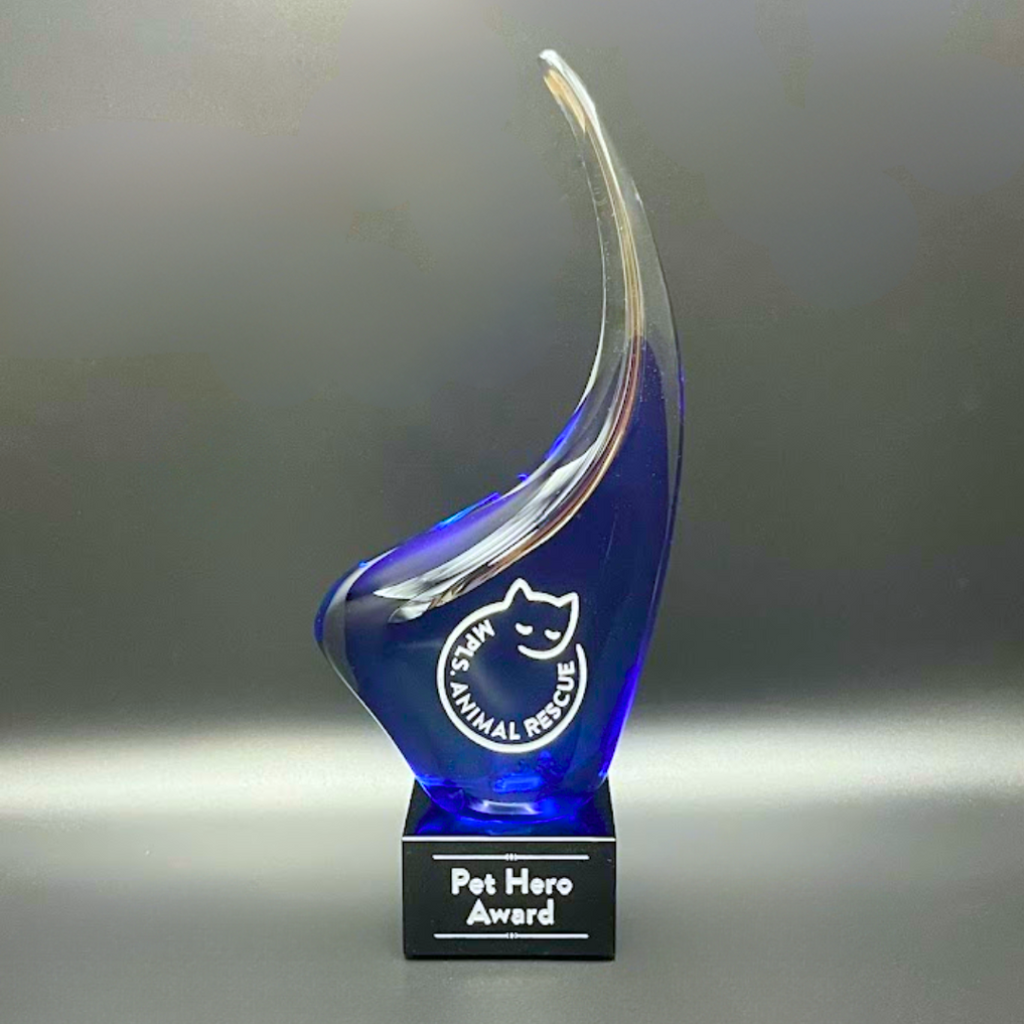 This beautiful 11.5" teardrop art glass is filled with breathtaking deep indigo color and has a rich and professional look. All of our art glass is hand-made to ensure that no two pieces are identical. Every award is true "one of a kind" and bound to impress! Also available in 8.5" size.